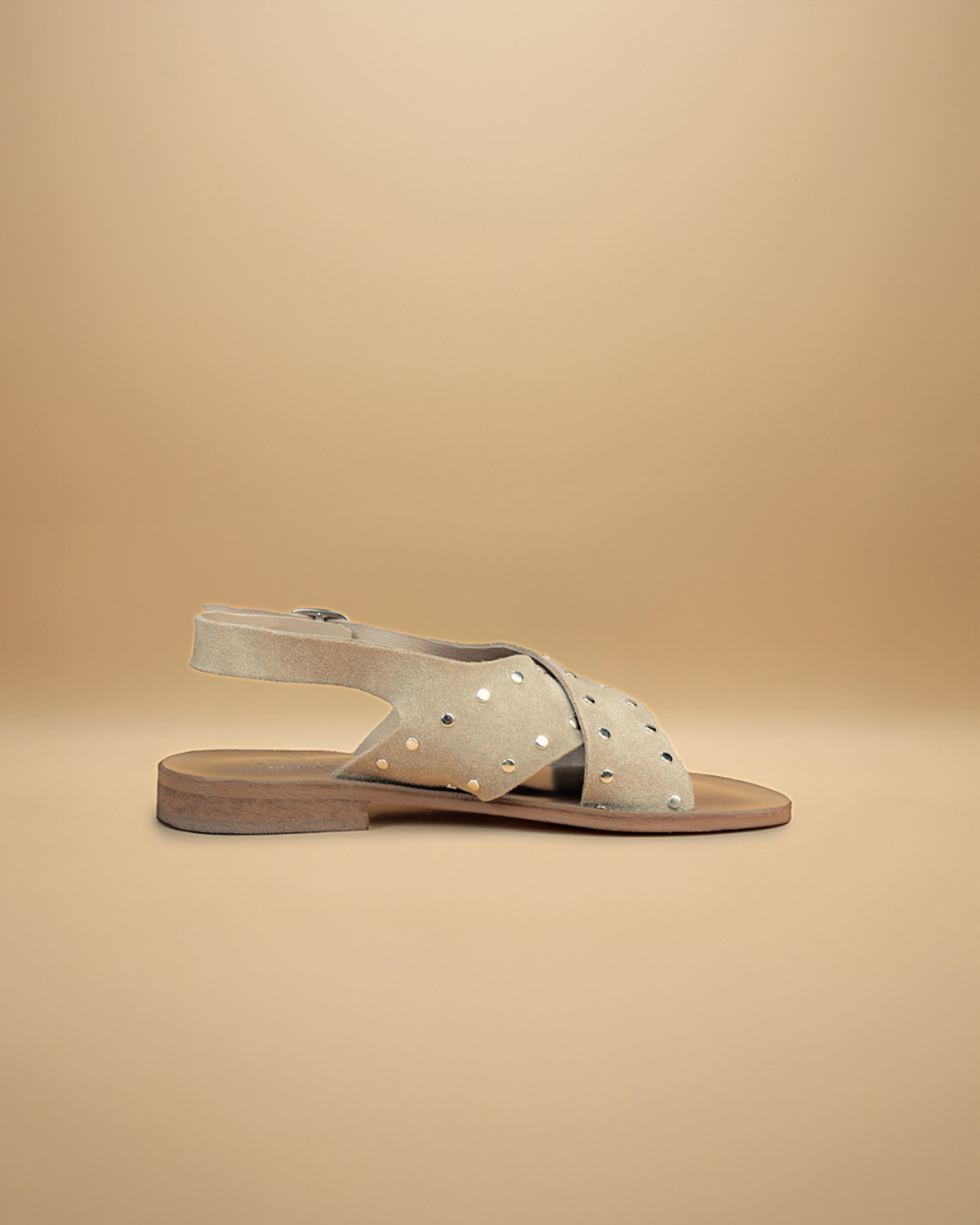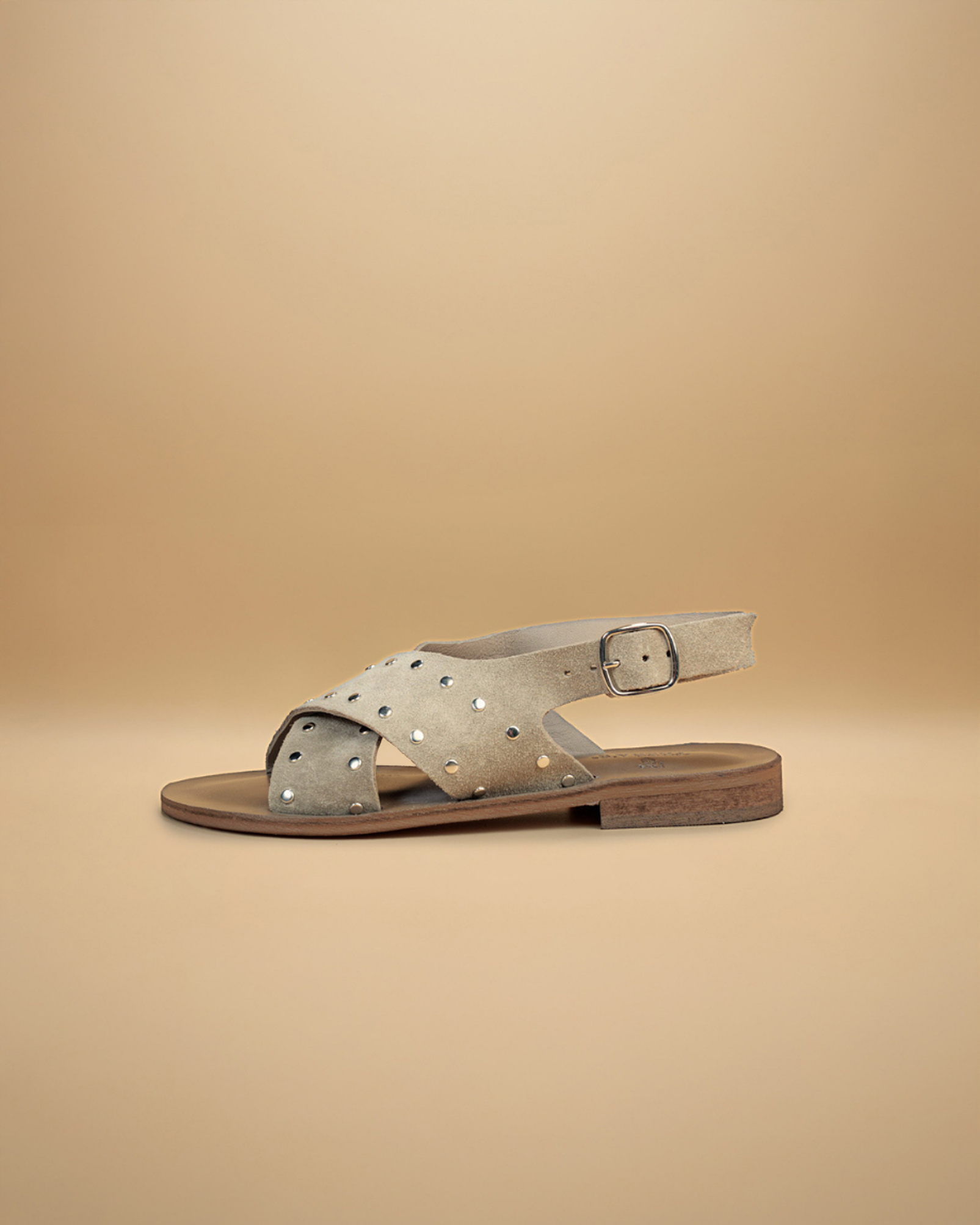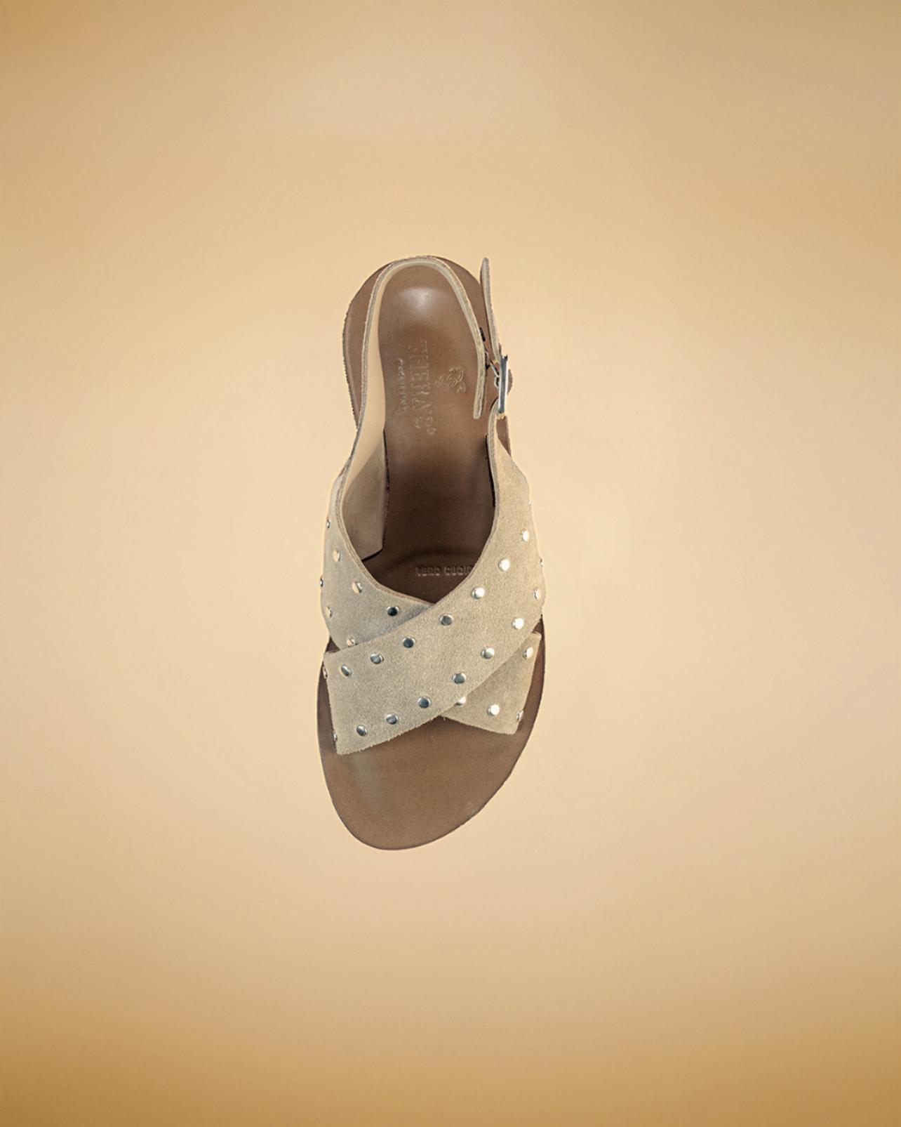 “Questo sandalo dal design raffinato e contemporaneo è realizzato in morbido camoscio, impreziosito da piccole borchie color argento che aggiungono un tocco luminoso e moderno. Le fasce incrociate sul collo del piede avvolgono delicatamente la pianta, garantendo comfort e stabilità.
