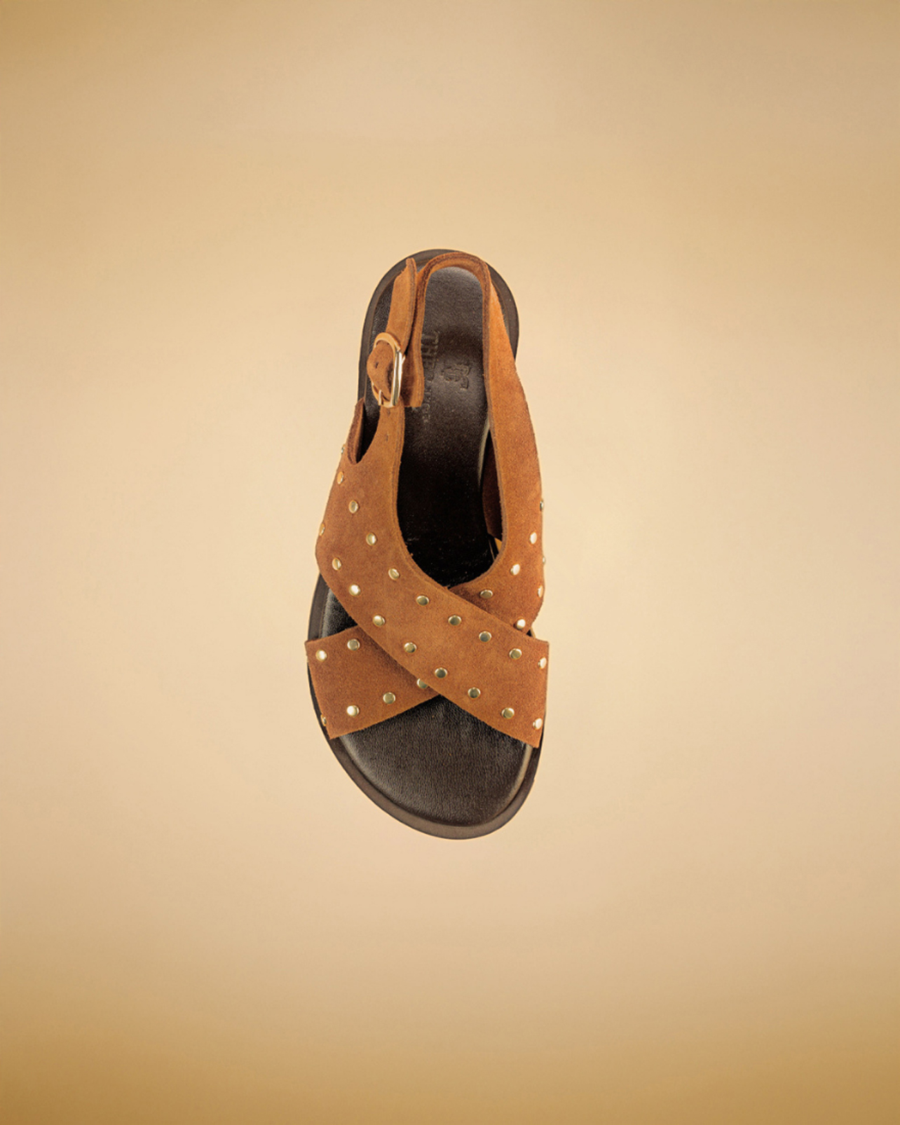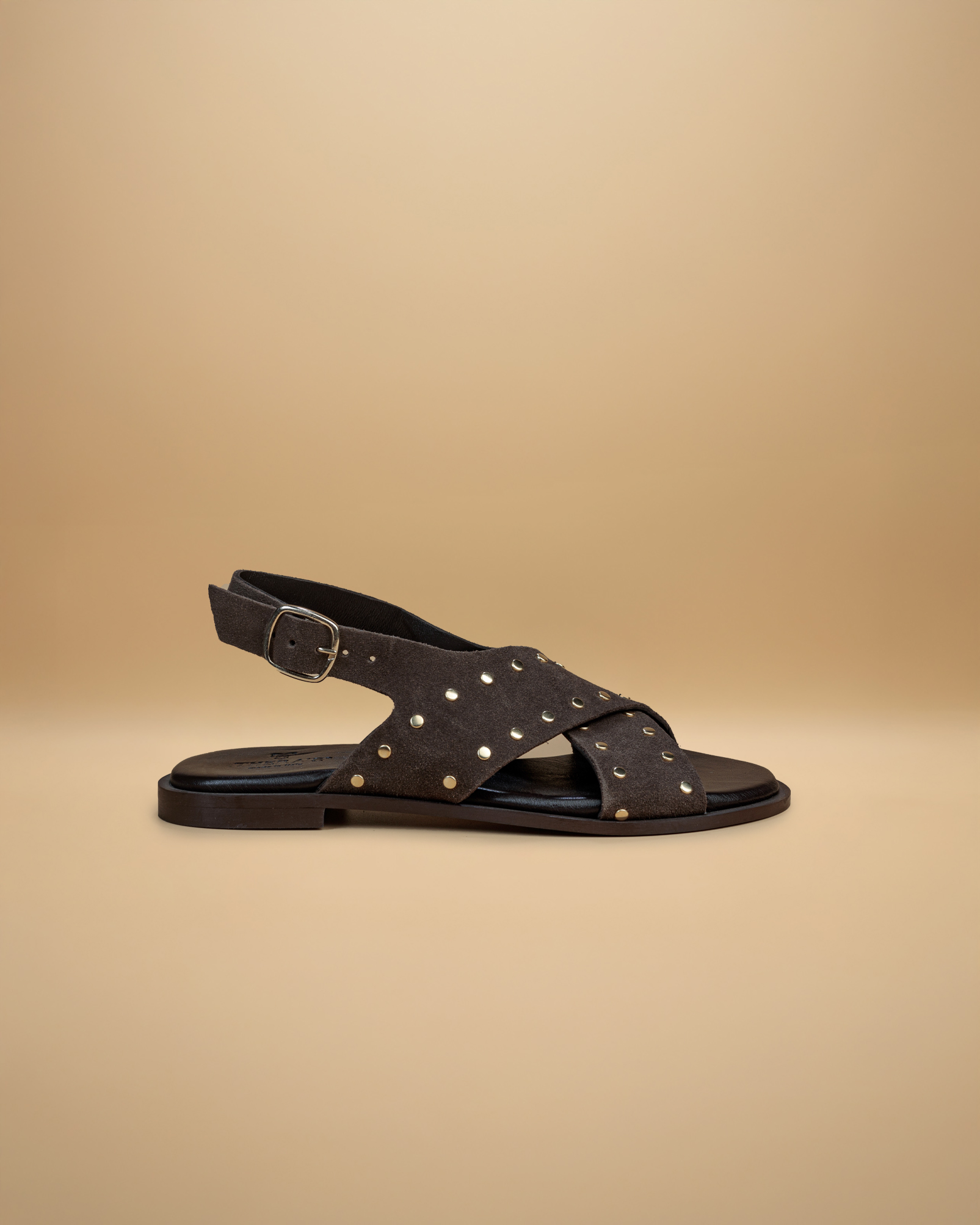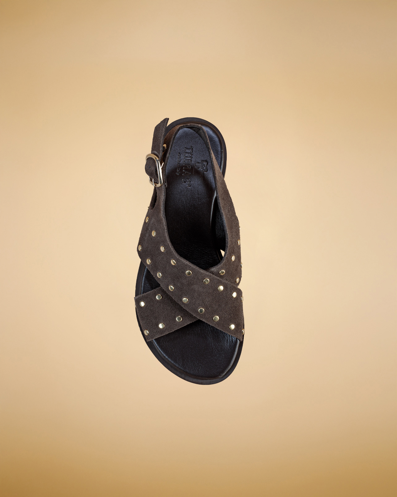 “Questo sandalo in morbido camoscio unisce comfort e stile in un design contemporaneo. Le fasce incrociate sul collo del piede, impreziosite da piccole borchie dorate, donano un tocco grintoso e raffinato.