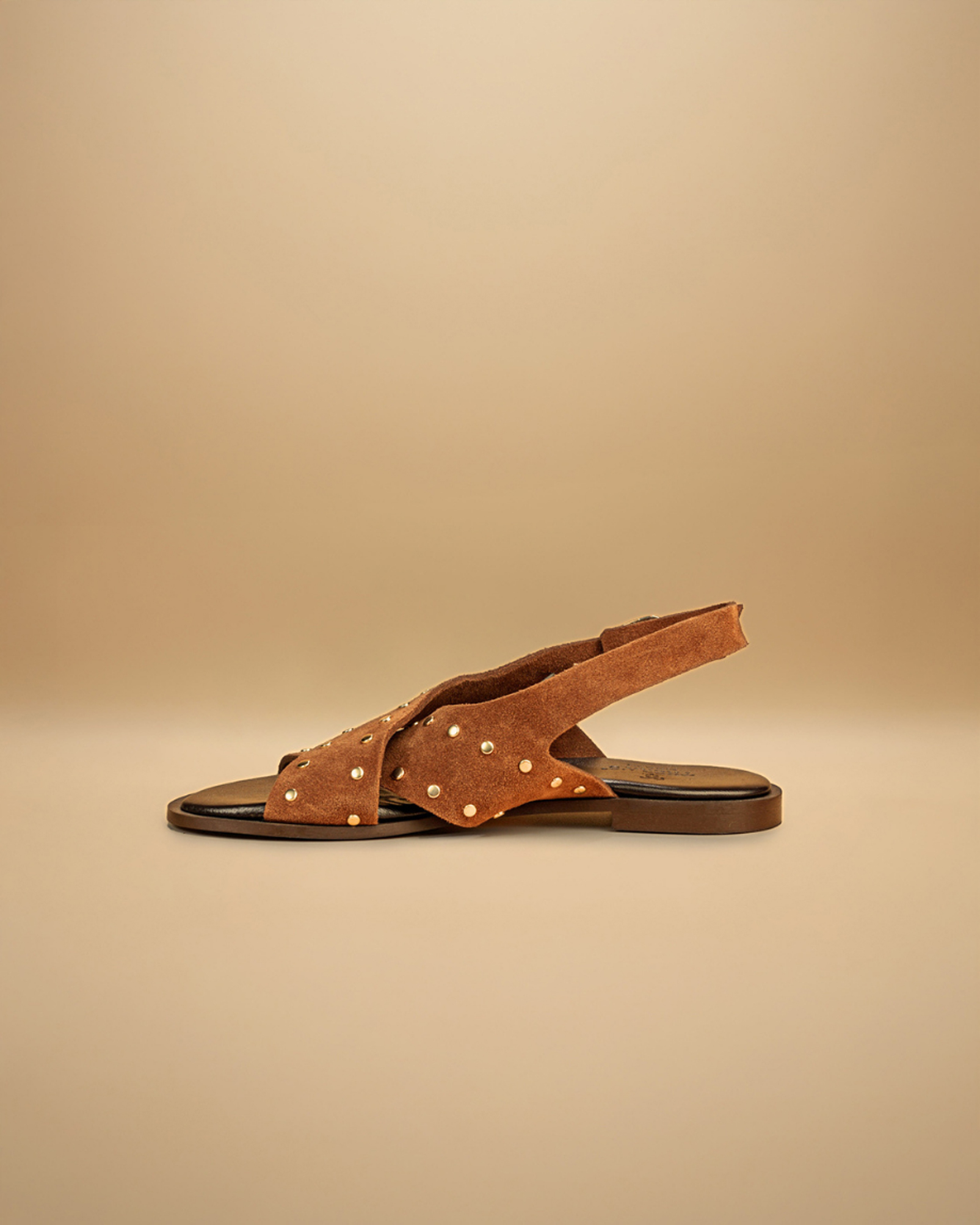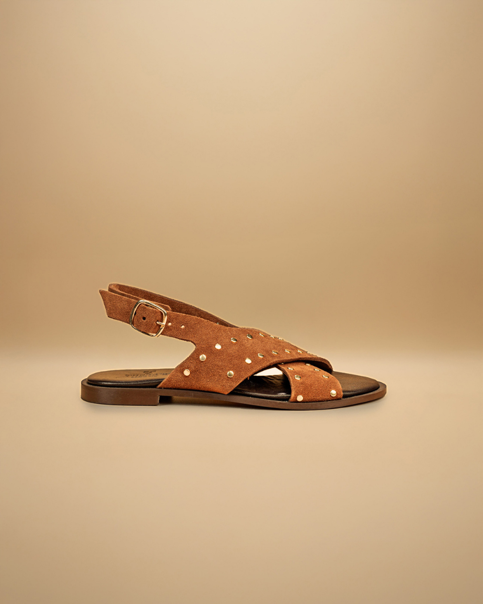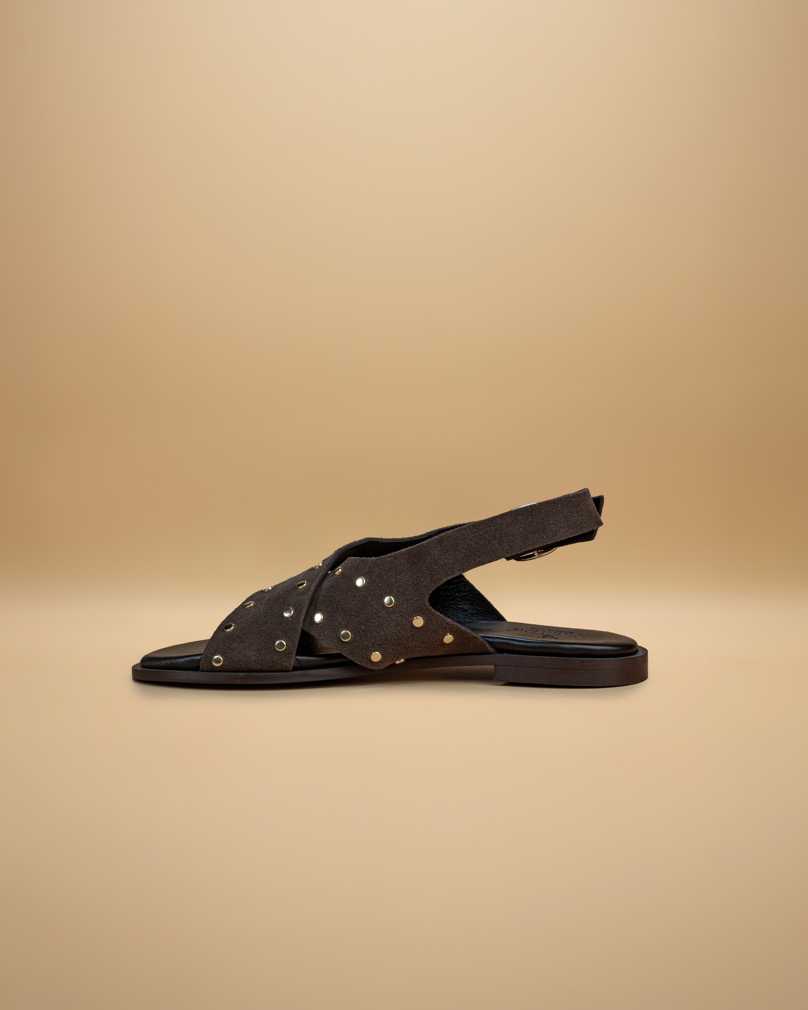 “Questo sandalo in morbido camoscio unisce comfort e stile in un design contemporaneo. Le fasce incrociate sul collo del piede, impreziosite da piccole borchie dorate, donano un tocco grintoso e raffinato.
