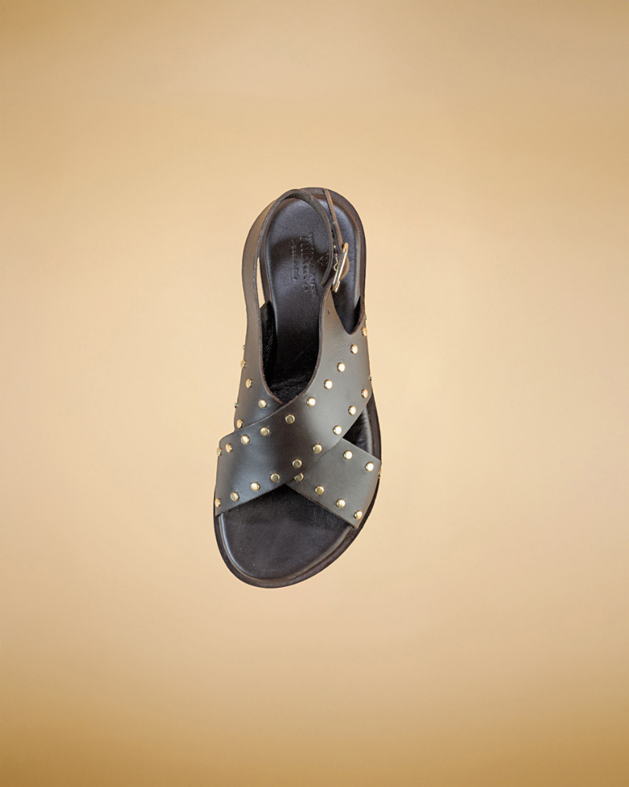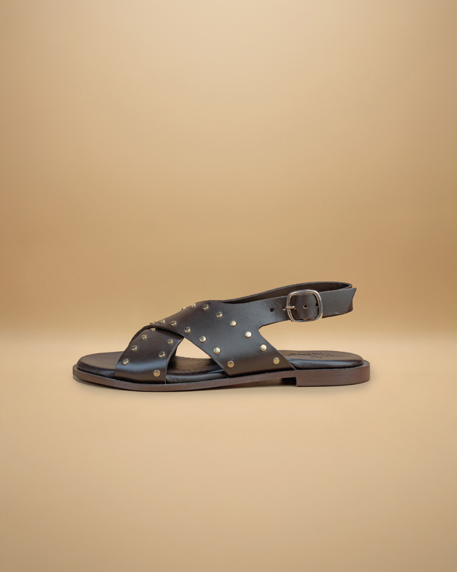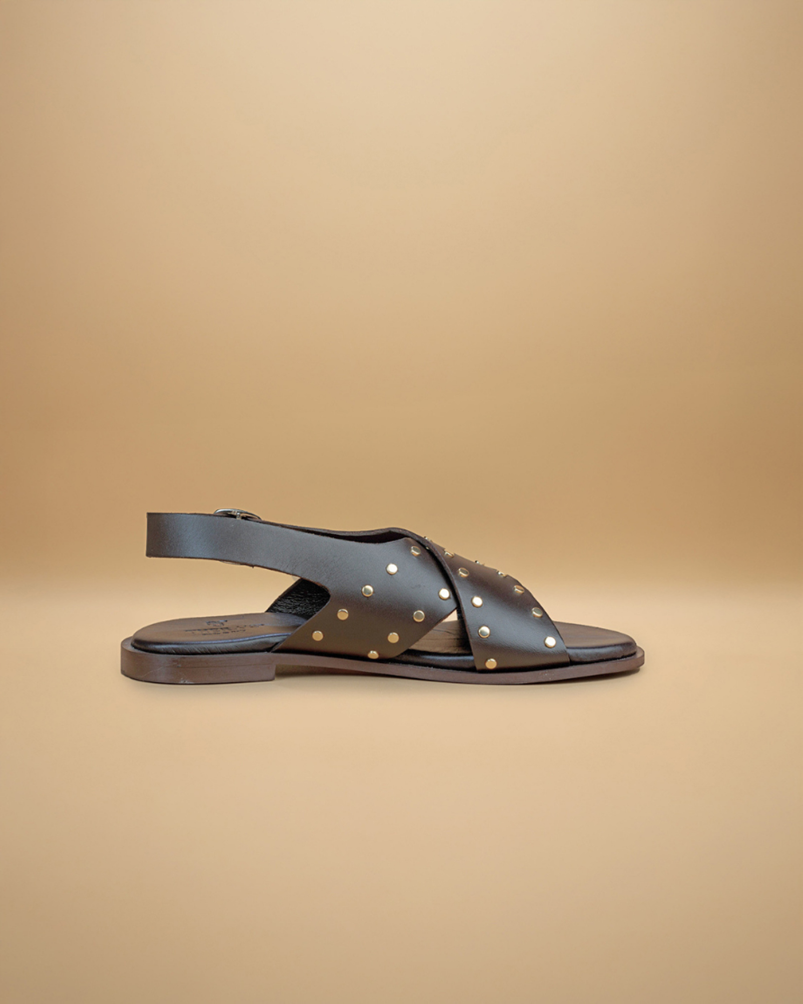 “Questo sandalo dal design moderno e grintoso è realizzato in morbida pelle, impreziosito da piccole borchie dorate che aggiungono un tocco di carattere e luminosità. Le fasce incrociate sul collo del piede avvolgono con eleganza, garantendo comfort e stabilità durante la camminata.